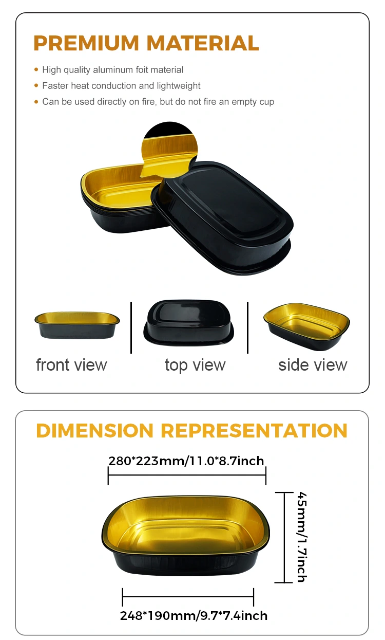 Kontainer emas aluminium foil sing nganggo aluminium catering persegi panjang aluminium sing persegi aluminium cocog kanggo macem-macem wong utawa serving siji utawa skenario dining layanan dhewe, luwih cocog kanggo bungkusan utawa pasta panggang. Produk iki uga cocog kanggo kemasan kothak panganan, katering lan njupuk, uga kemasan saka sajian sing disiapake. Wadhah kasebut digawe saka foil aluminium kelas sing berkualitas tinggi, sing aman lan ora enak, lan ketemu standar kontak panganan internasional. Yen digabungake karo film panyeget panas, bisa entuk Seak efisien kanthi efisien lan ngilangi bocor sup sing efektif, sing cocog kanggo peralatan panyusun otomatis. Wadah kasebut duwe permukaan sing lancar lan rata kanggo label sing gampang lan penampilan sing apik sing mbantu nambah gambar merek. Tanduran suhu sing dhuwur lan sithik, bisa digunakake ing suhu suhu -20 ° C nganti 250 ° C, lan ndhukung macem-macem cara pemanasan kayata manggang, lan steaming. Bahan foil aluminium 100% daur ulang lan nyetak syarat pangembangan sustainable.