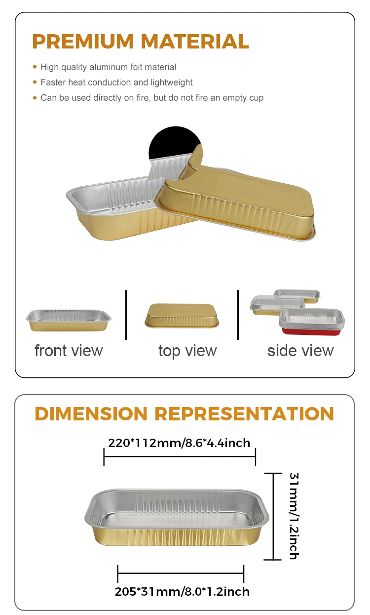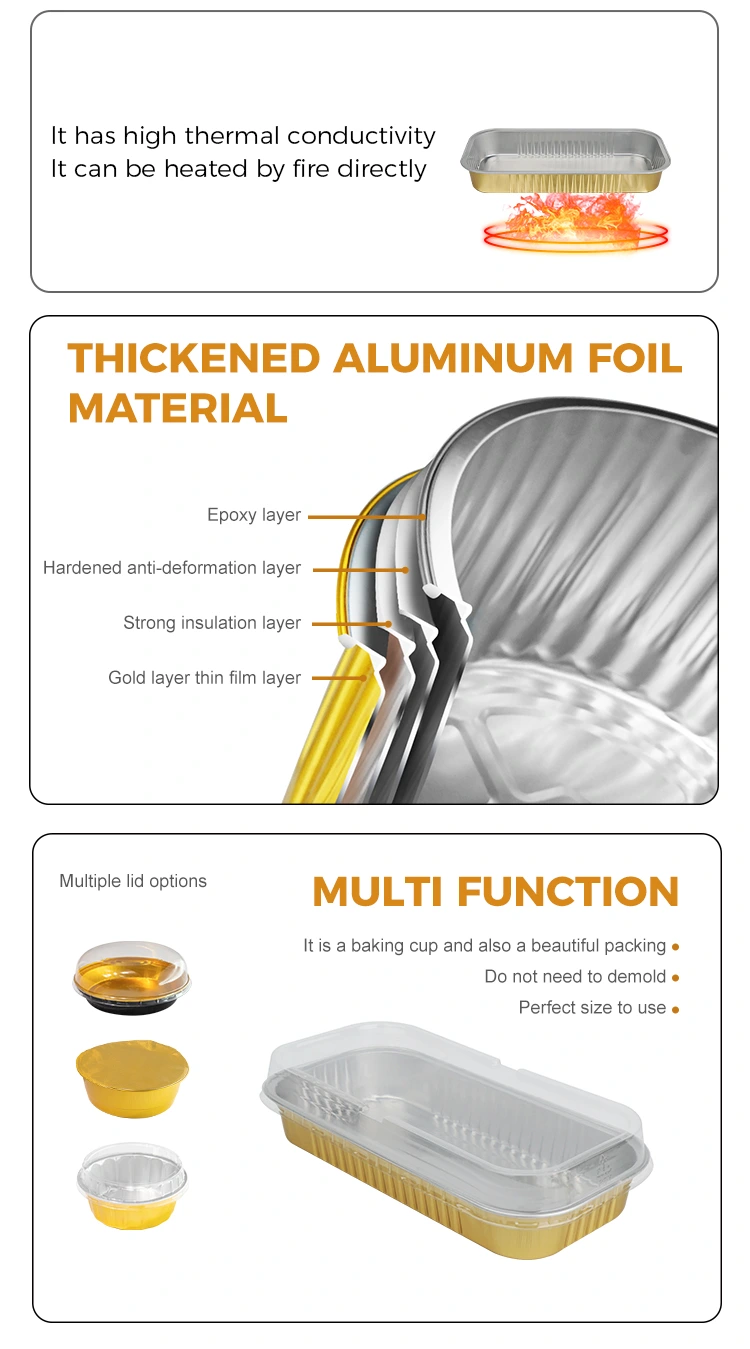 Takeout Catering: Cocog kanggo ngirim panganan sewa gaya Kulon lan panganan cuci mulut panggang. Penampilan emas nambah gambar merek, lan bahan foil aluminium uga bisa duwe peran tartamtu kanggo pengawetan panas.