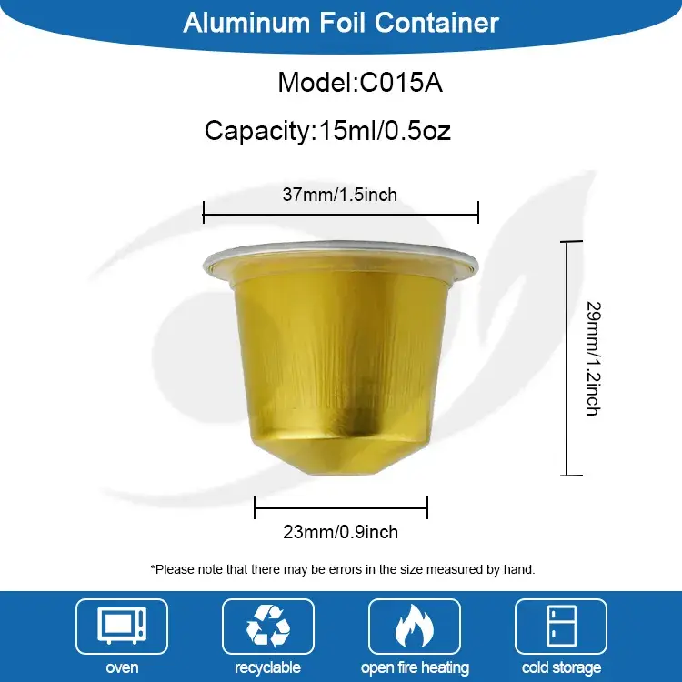 Pembekalan foil aluminium Yunhu Silicone-segel C0sazon Cipsul C015A ing ukuran ngisor: diameteripun 0 mm (udakara 29 inci), udakara 1,1 inci). Kapsul iki nyekel 15 ml (udakara 0,5 oz) kopi lemah, cairan kopi. Cocog kanggo kabeh mesin nespresso, cairan espresso sing dibungkus, lan bisa uga dilanjutake karo rinsing nitrogen. Kajaba iku, logo lan warna uga bisa disesuaikan, lan pola kasebut bisa dicithak ing tutup aluminium aluminium, lan logo kasebut bisa uga dicap ing ngisor kapulane kopi.