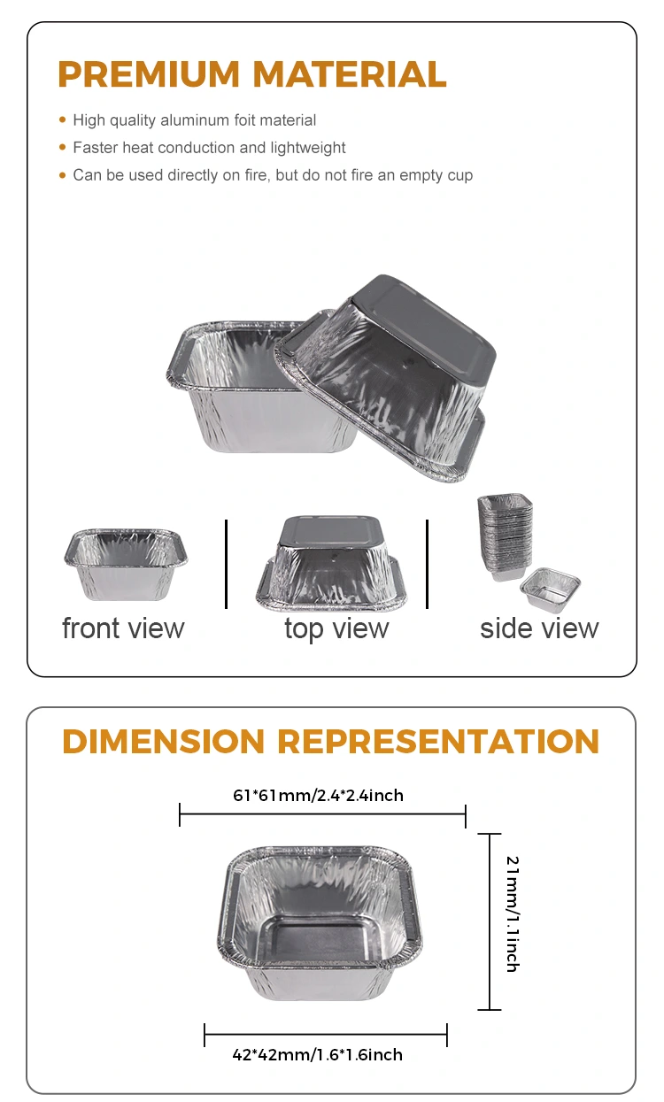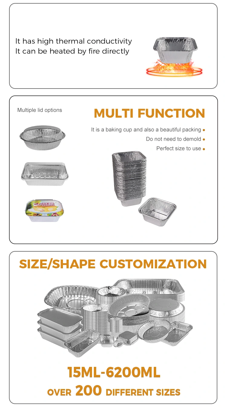 Kontaner aluminium aluminium kecantikan aluminium udara sing bisa digunakake ing udara fryers, kue cilik, panganan cilik, lan sapiturute, lan sapiturute, lan condesine cilik lan manggang. Kanggo mesthekake yen wadhah foil aluminium cilik sing dimuat ing wadhah kasebut seger, digawe saka bahan putih aluminium salaka 8011, sing digawe kanthi resik lan tumindak kanthi cerah lan cilaka, lan ukuran kasebut sugih lan cocog kanggo macem-macem pemandangan.