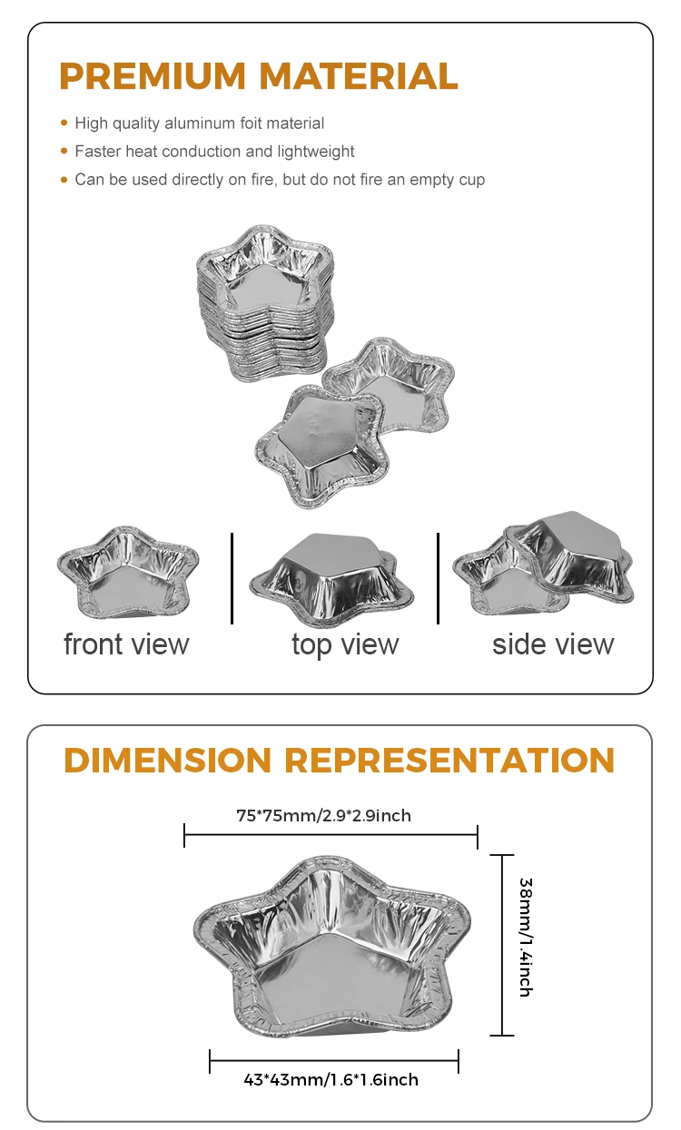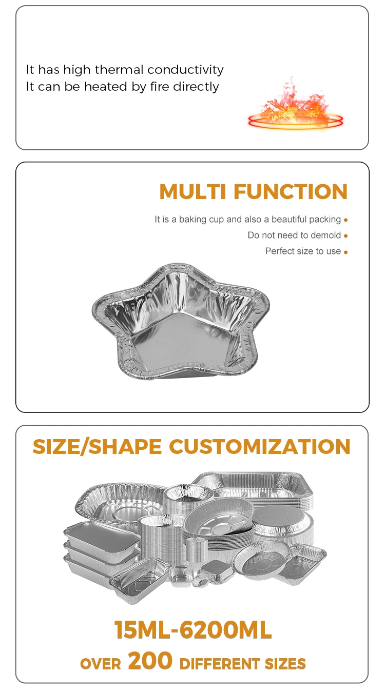 Pembuangan aluminium foil aluminium Star-shaping wangun kontaner kanggo baking aluminium, cetha aluminium counter kanthi bahan foil stabil, digawe luwih gampang ditabuh sawise baking. Telung bentuke aluminium berbentuk lintang iki kanggo kontaner panganan bakar aluminium tahan suhu dhuwur, ora gampang diobong utawa dicepetake lan diproses kanthi becik lan diproses sanajan diolah lan diproses kanthi goreng, kukus, manggang, lsp.